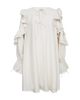 CMMOLLY-DRESS er en løs tunikakjole i en blød, vævet lyocell-blanding med en subtil glans og en let gennemsigtighed. Den A-formede silhuet har en dyb nøglehul-udskæring med delikate bindebånd og ekstravagante, lagdelte flæsepaneler langs ærmerne. Snorjusterede manchetter, der kan strammes for en markeret klokkeform eller løsnes for en blød, luftig silhuet.