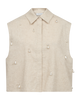CMMELAN-SHIRT er en ærmeløs skjorte i en lige, boxy silhuet, udført i en vævet hørblanding med naturlig tekstur. Den klassiske skjortekrave og skjulte stolpelukning skaber et rent og raffineret udtryk, mens påsyede perler i organisk dråbeform på både for- og bagstykke tilfører et skulpturelt og dekorativt element. Bærestykke bagpå med boxlæg giver let volumen og form.